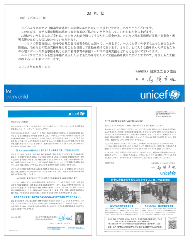 SDGsへの取組として、第19期売上の一部を日本ユニセフ協会「ガザ人道危機緊急募金」へ支援いたしました。